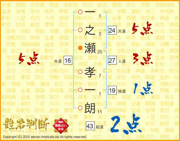一(1画)之(3画)瀬(20画) 孝(7画)一(1画)朗(11画)