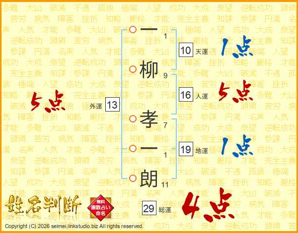 一(1画)柳(9画) 孝(7画)一(1画)朗(11画)