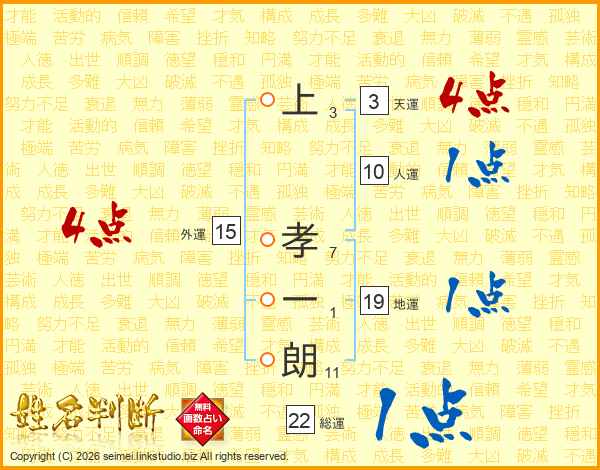 家系が持つ宿命的な運勢を表します。祖先から受け継いだ苗字ですので自分の力が及びません。家柄を象徴します。苗字の合計画数。