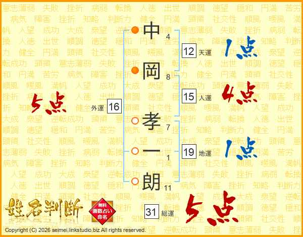 中岡孝一朗さんの人運は15画の4点!