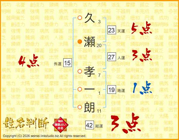 久(3画)瀬(20画) 孝(7画)一(1画)朗(11画)