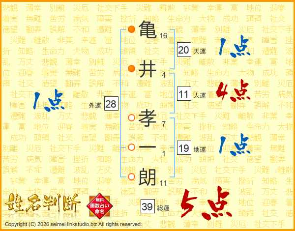 亀(16画)井(4画) 孝(7画)一(1画)朗(11画)