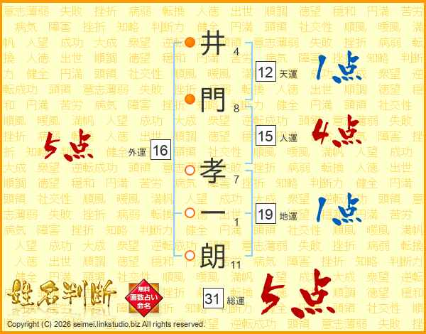 井(4画)門(8画) 孝(7画)一(1画)朗(11画)