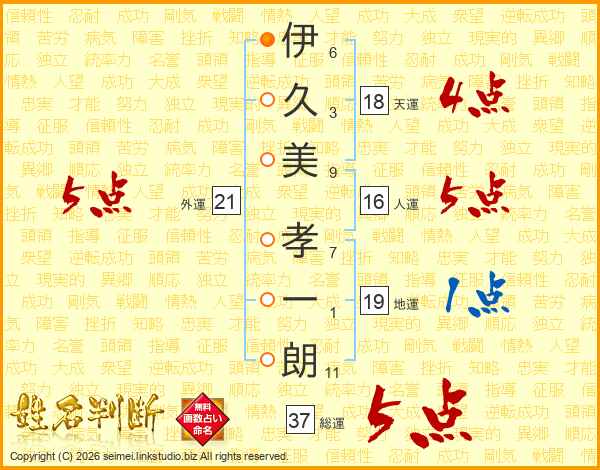 伊(6画)久(3画)美(9画) 孝(7画)一(1画)朗(11画)
