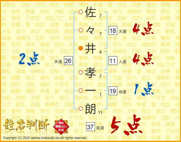 佐(7画)々(7画)井(4画) 孝(7画)一(1画)朗(11画)