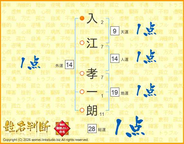 入(2画)江(7画) 孝(7画)一(1画)朗(11画)