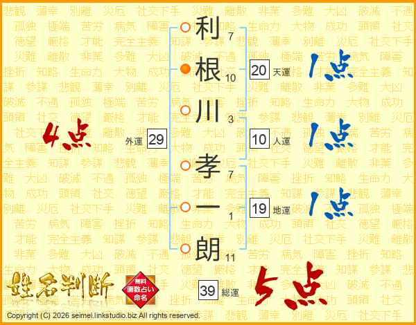 利根川孝一朗さんの総運は39画の5点!