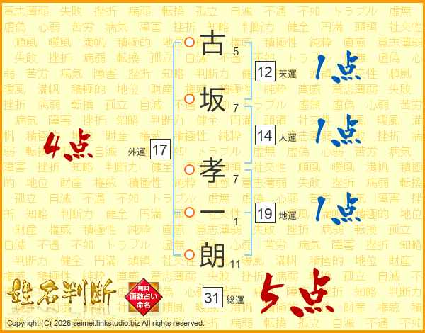 古(5画)坂(7画) 孝(7画)一(1画)朗(11画)