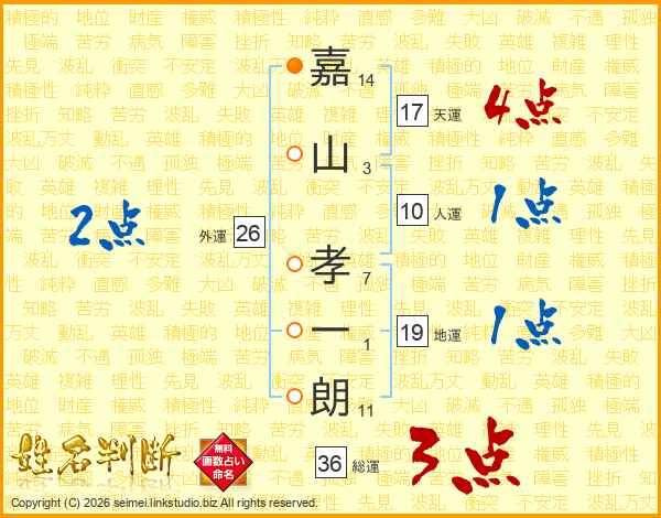 嘉(14画)山(3画) 孝(7画)一(1画)朗(11画)