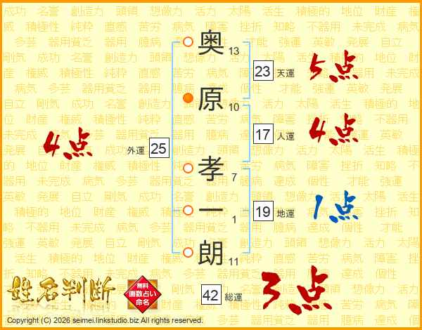 奥(13画)原(10画) 孝(7画)一(1画)朗(11画)