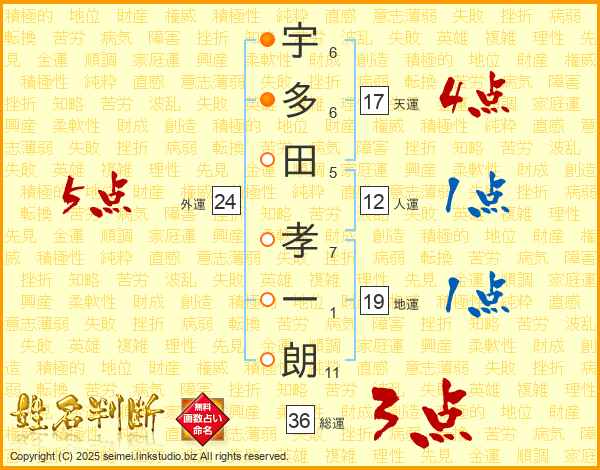 宇(6画)多(6画)田(5画) 孝(7画)一(1画)朗(11画)