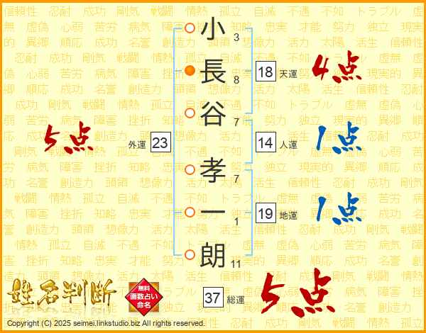 小(3画)長(8画)谷(7画) 孝(7画)一(1画)朗(11画)