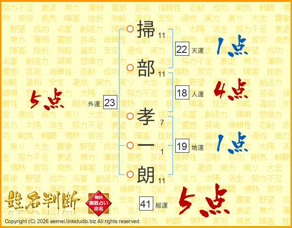 掃(11画)部(11画) 孝(7画)一(1画)朗(11画)