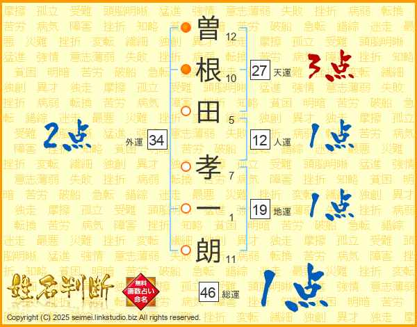 曽(12画)根(10画)田(5画) 孝(7画)一(1画)朗(11画)