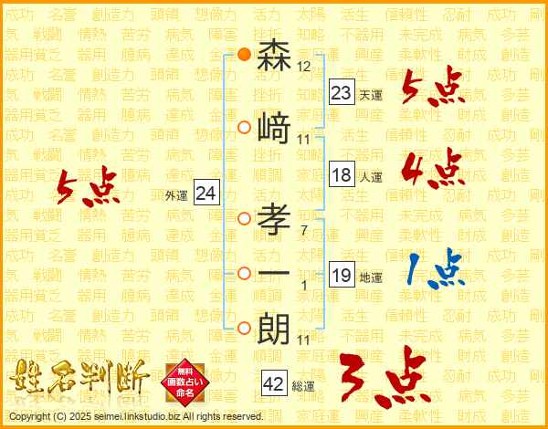 森(12画)﨑(11画) 孝(7画)一(1画)朗(11画)