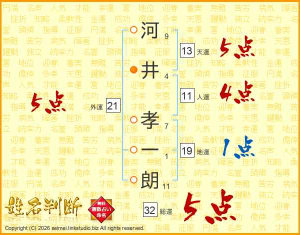 河井孝一朗さんの総運は32画の5点!