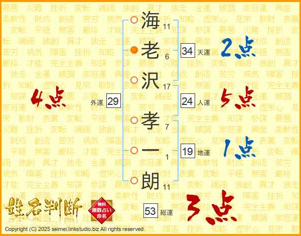 海(11画)老(6画)沢(17画) 孝(7画)一(1画)朗(11画)