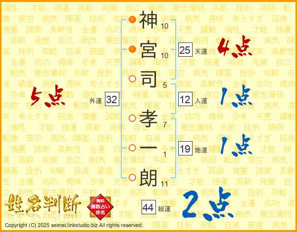神(10画)宮(10画)司(5画) 孝(7画)一(1画)朗(11画)
