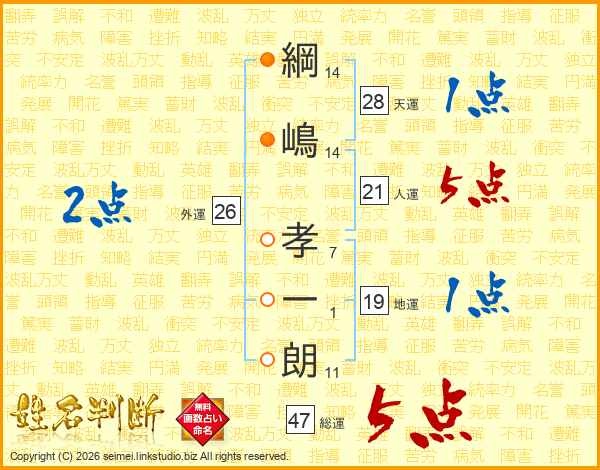 綱(14画)嶋(14画) 孝(7画)一(1画)朗(11画)
