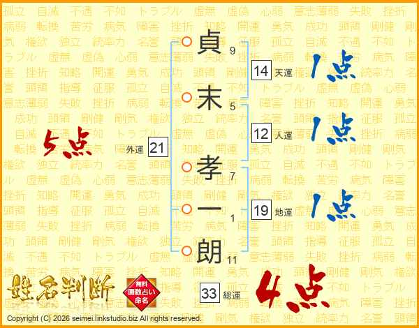 貞(9画)末(5画) 孝(7画)一(1画)朗(11画)