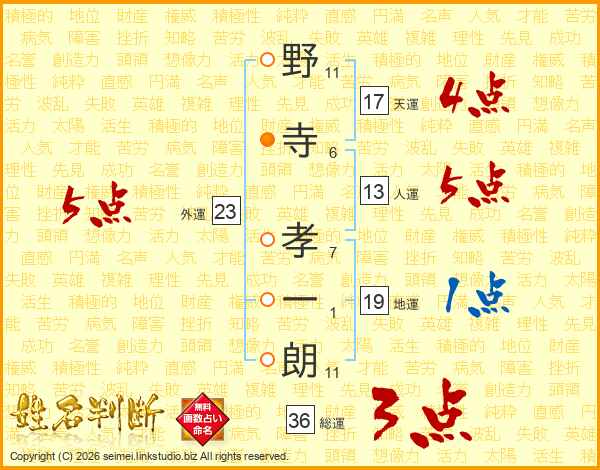 野(11画)寺(6画) 孝(7画)一(1画)朗(11画)