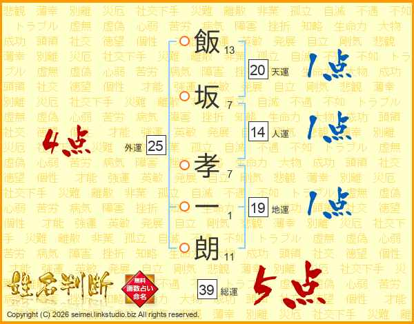 飯(13画)坂(7画) 孝(7画)一(1画)朗(11画)