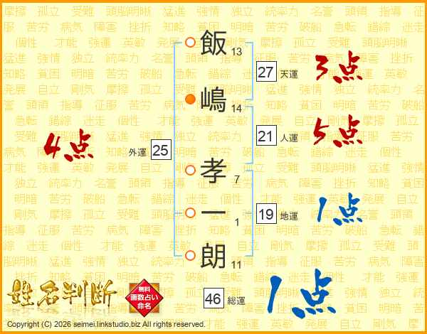 飯(13画)嶋(14画) 孝(7画)一(1画)朗(11画)