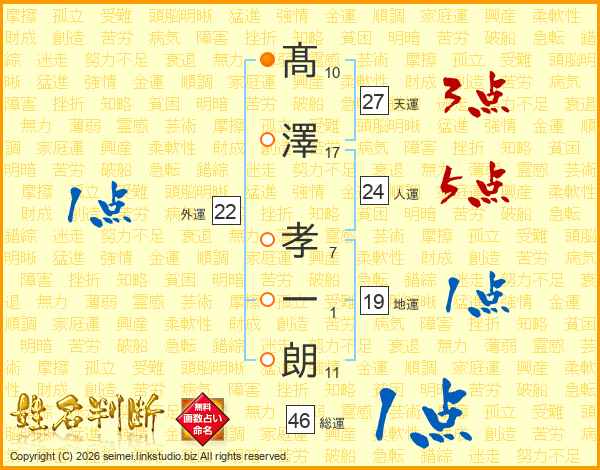 髙(10画)澤(17画) 孝(7画)一(1画)朗(11画)