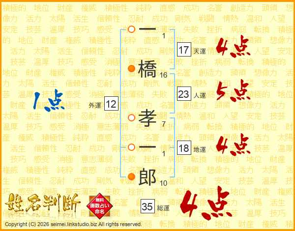 一(1画)橋(16画) 孝(7画)一(1画)郎(10画)