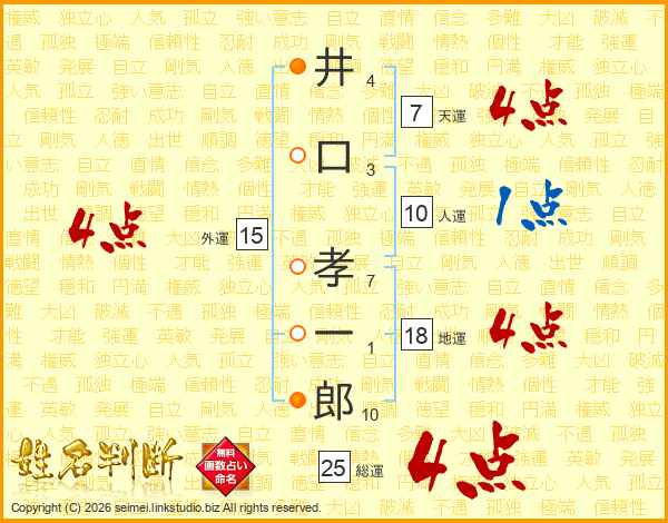 井(4画)口(3画) 孝(7画)一(1画)郎(10画)