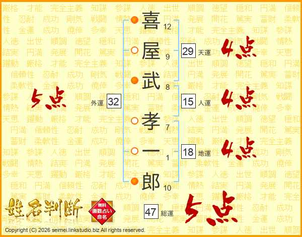 喜(12画)屋(9画)武(8画) 孝(7画)一(1画)郎(10画)