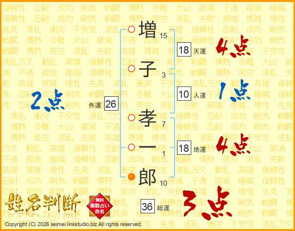 増(15画)子(3画) 孝(7画)一(1画)郎(10画)