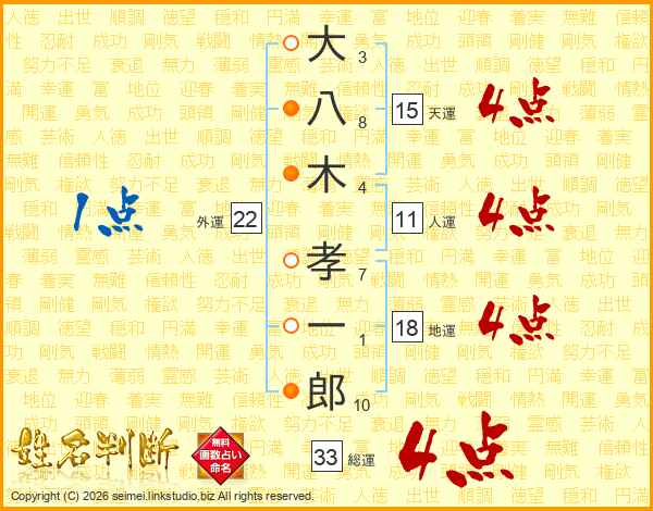 大(3画)八(8画)木(4画) 孝(7画)一(1画)郎(10画)