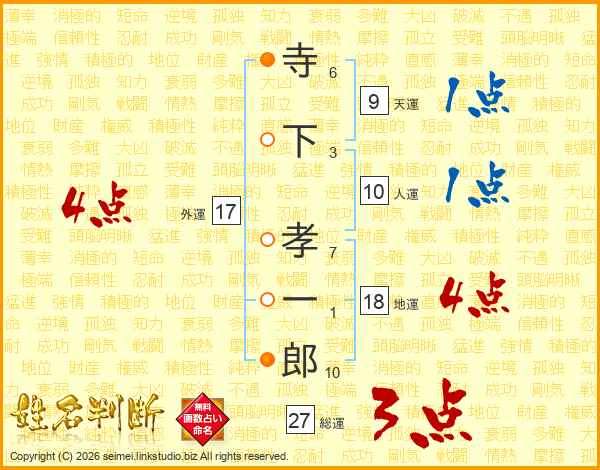 寺(6画)下(3画) 孝(7画)一(1画)郎(10画)