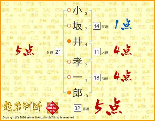 小(3画)坂(7画)井(4画) 孝(7画)一(1画)郎(10画)