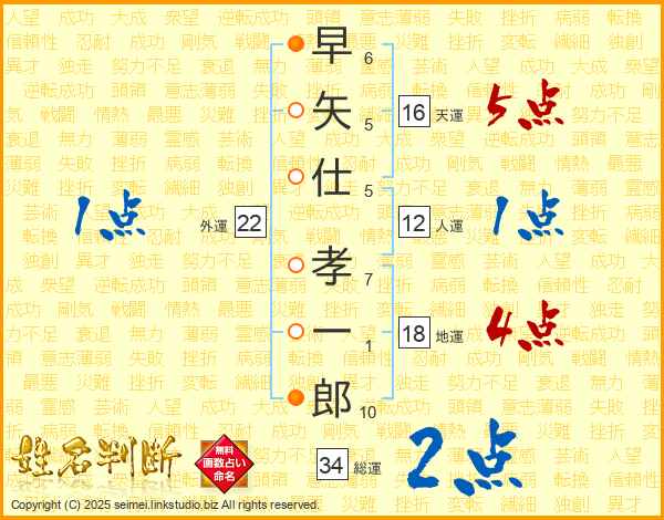 早(6画)矢(5画)仕(5画) 孝(7画)一(1画)郎(10画)