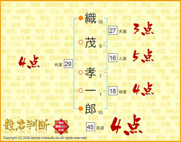 織(18画)茂(9画) 孝(7画)一(1画)郎(10画)