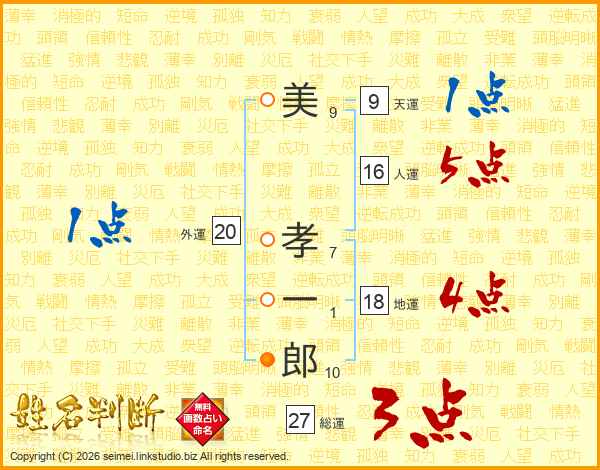 あなたの人生を表す1番重要な運勢です。生涯を通じて影響する総合運となり、主に50歳以降の晩年期に影響を及ぼします。苗字と名前の合計画数。