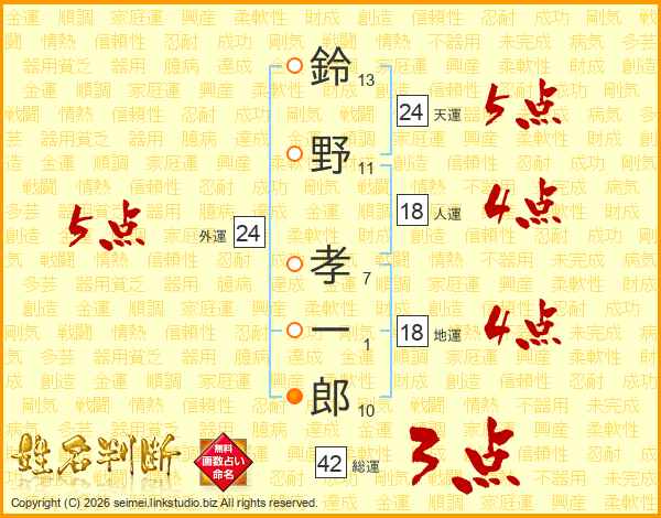 鈴(13画)野(11画) 孝(7画)一(1画)郎(10画)