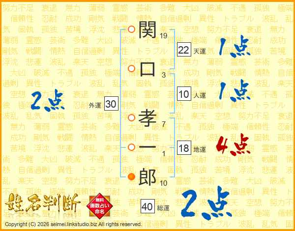 関(19画)口(3画) 孝(7画)一(1画)郎(10画)