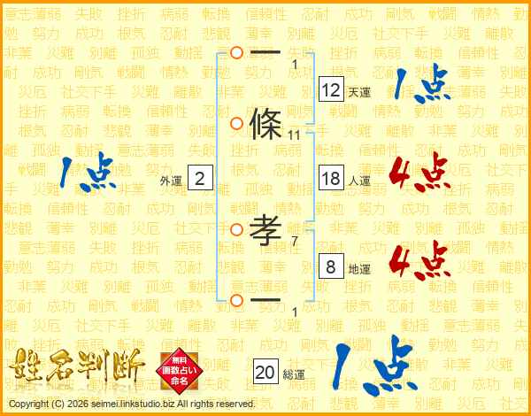 あなたの人生を表す1番重要な運勢です。生涯を通じて影響する総合運となり、主に50歳以降の晩年期に影響を及ぼします。苗字と名前の合計画数。