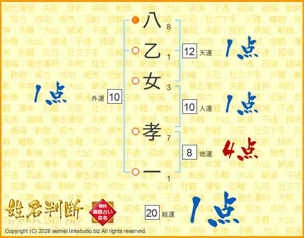 生活面を象徴する運勢です。外部から受ける影響力を表し、結婚運、家庭運や職場、環境への順応性を表します。総運から人運を引いた画数。姓や名が1文字の場合を除く。