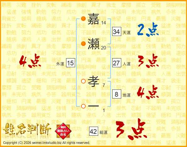 嘉(14画)瀬(20画) 孝(7画)一(1画)
