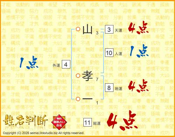 あなたの人生を表す1番重要な運勢です。生涯を通じて影響する総合運となり、主に50歳以降の晩年期に影響を及ぼします。苗字と名前の合計画数。