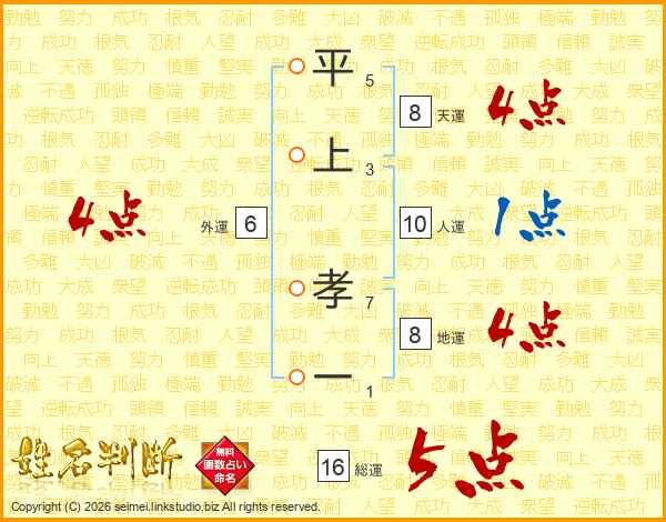 生活面を象徴する運勢です。外部から受ける影響力を表し、結婚運、家庭運や職場、環境への順応性を表します。総運から人運を引いた画数。姓や名が1文字の場合を除く。