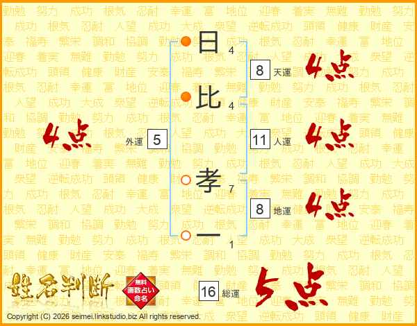 あなたの人生を表す1番重要な運勢です。生涯を通じて影響する総合運となり、主に50歳以降の晩年期に影響を及ぼします。苗字と名前の合計画数。