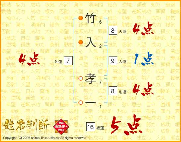 生活面を象徴する運勢です。外部から受ける影響力を表し、結婚運、家庭運や職場、環境への順応性を表します。総運から人運を引いた画数。姓や名が1文字の場合を除く。