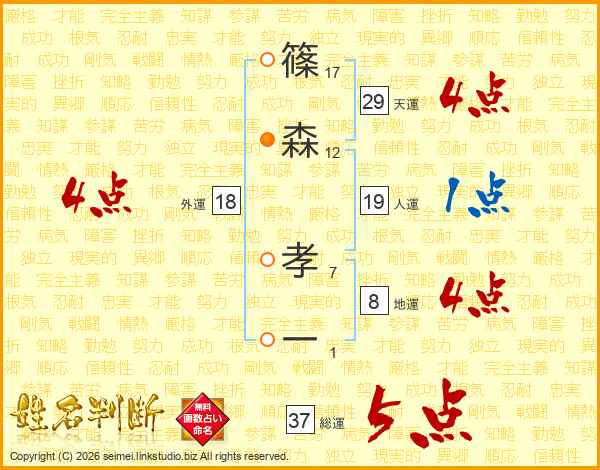 家系が持つ宿命的な運勢を表します。祖先から受け継いだ苗字ですので自分の力が及びません。家柄を象徴します。苗字の合計画数。