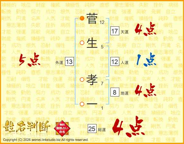 菅(12画)生(5画) 孝(7画)一(1画)