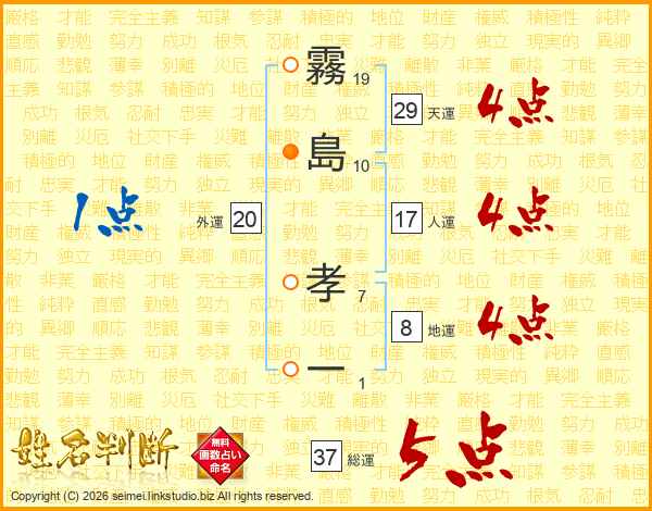 霧島孝一さんの総運は37画の5点!